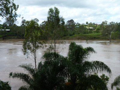 The river is at its peak, about 25m above normal. Another 2-3m to go to the house. We spent Tuesday night in the Tardis near the local shops. Our neighbours had a bit of a sleepless night watching the river. We knew it had peaked because we could see the river gauge measurements plotted on the internet. We also had our own stick and a tape measure. |