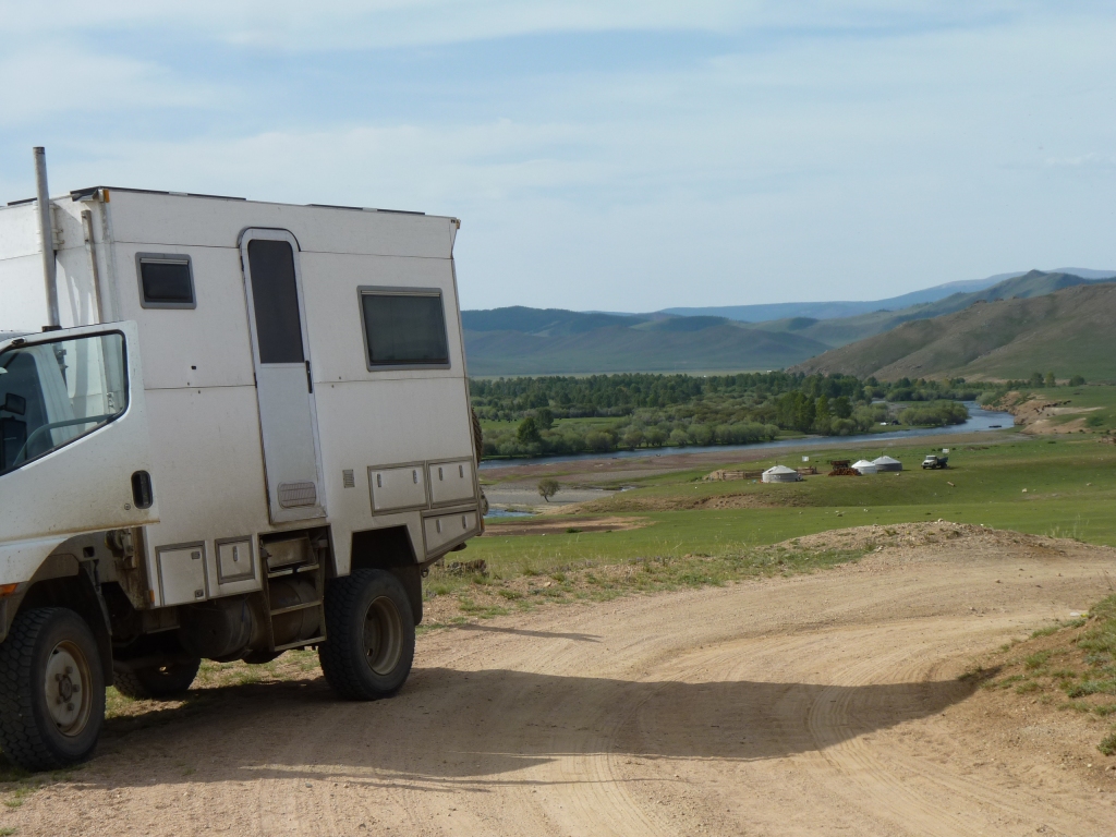 We are now well South East of where we'd planned to be. A slight change of plan. We'll take the circle route back to Tsetserleg. For a while it looked like we were on the wrong side of this river and would have to follow it North for about 10km to a crossing shown on the map. We can see a town we recognise about 10km away. We stopped for the night. |