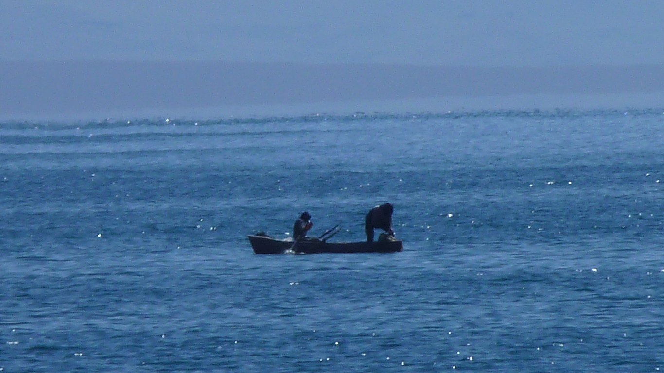There are three people fishing. We've seen a few leftover bits of very fine nets. We couldn't find their tyre marks to reach the edge. There are a couple of boats far out in the lake but not launched here.. |