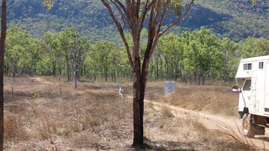 surrounding hills. We left the campsite at 07:30, the sun is still young. We are in a series of valleys that extend into the Arnhem Land / Marrawal plateaus. The main north south escarpment is to our west. As well as mining (our track is described as "prospecting") there has also been agriculture. |