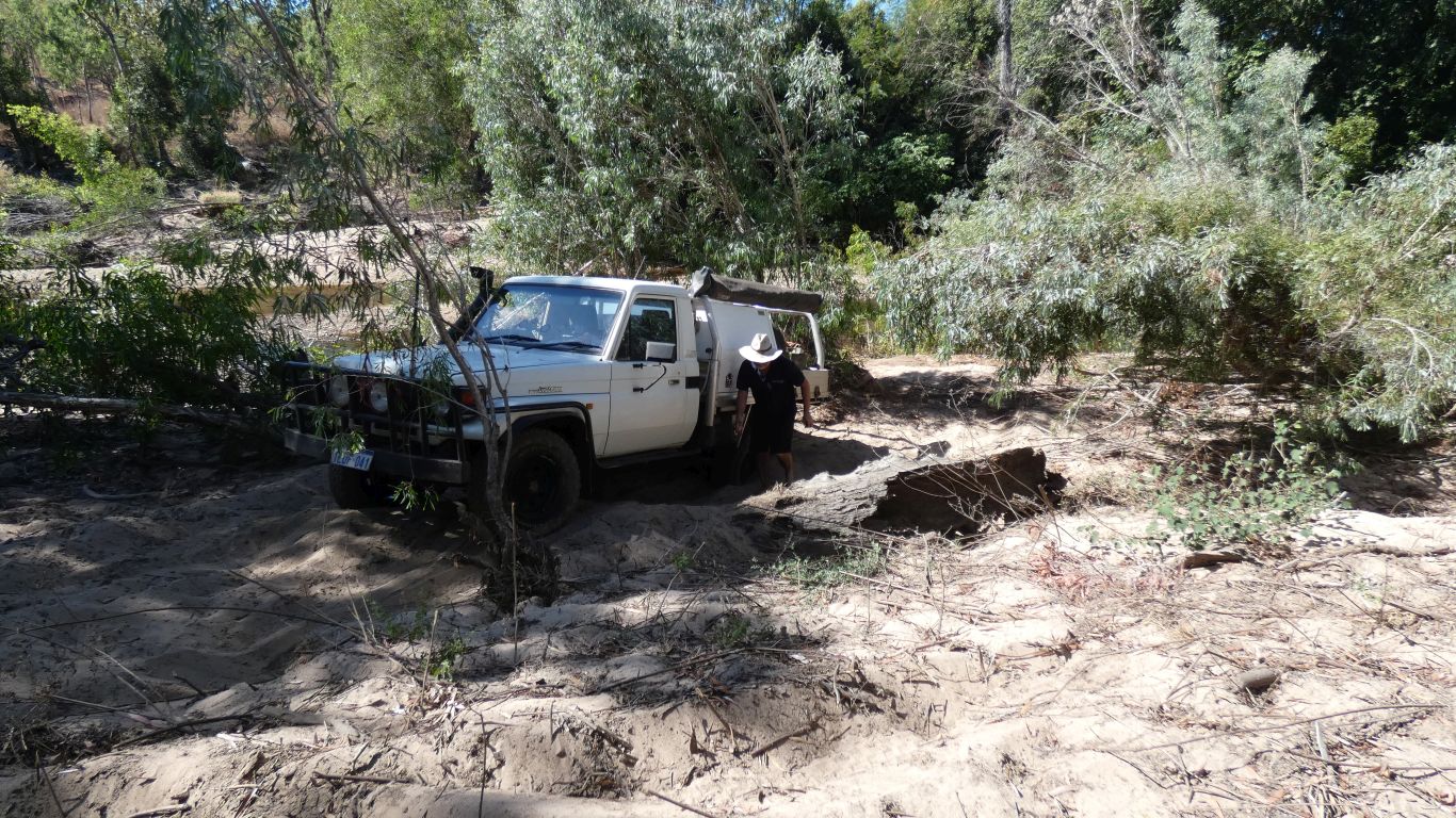 over the creek. Almost failed, washed away in some long ago wet season, someone has laid poles and steel grids over what looks like old steel girders. This was a bit more than a simple prospecting track. |