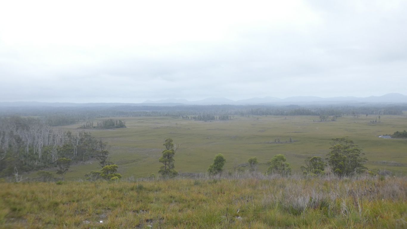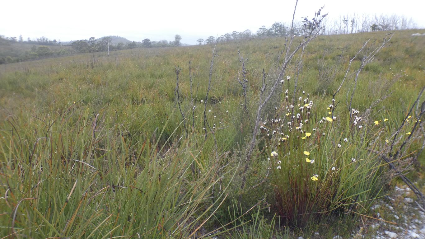 Not all button grass plains are born equal. Whatever the cause, perhaps the underlying siltstones and peat, there seems to be more variety in the vegetation. The satellite image shows this area as red rather than the colour of all the other button grass plains. Looks like its been burned in the last year or two and is recovering. Its not as dense as Milkshake Hills, I can walk through it easily. Every mention of "button grass plain" is at pains to say that button grass is really a sedge. Grasses, of which there are more than I've had hot dinners, have hollow stems with nodes/joints, while sedges have solid triangular stems with no nodes. Sedges prefer more moist conditions than grasses. We can't help noticing that all the tracks we have walked have been dry, despite being in rain forest. The track we are walking on has gravel laid. We suspect it becomes a peat bog fairly quickly with a little rain. |