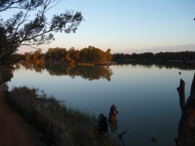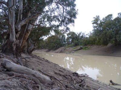The Darling has clay banks rather than the sand of the Murray. Almost no flow and no sunshine so very uninviting. |