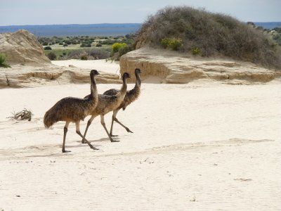 Outback public transport was much more extensive than now. We can only think travelling must have been tough. Walking over the dunes inside the lake were some Emus. |