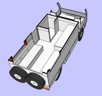 Google Sketchup is magic - once I'd figured out how to drive it. Significant sub-assemblies, such as the chassis, a fuel tank, the sub-frame, were drawn as components then "assembled". Drawing is directly as 3D. Neat. Clearly shown here is the extra fuel tank and the sub-frame with its three point mount (pivot at rear) and 4 extra supporting springs. Apparently the rails and supports have to be at least partially above the main chassis rails. This is what the Engineer needed to approve and ultimately sign off. Water tanks will fit within the sub-frame under the floor. |
