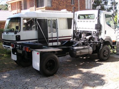 The tail section of the chassis was cut off by the previous owner. Just behind the rear spring hangers. If nothing else it provides a brilliant exit angle. It also meant that lengthening the springs to give softer suspension was not an option. Driving it as a cab/chassis for 600km was bone jarring,. Even with tyre pressures much reduced. The bouncing of the rear end translated into a fore and aft motion at head height in the cab. Turning the radio on carried the threat of broken fingers. The previous Coaster project, destined to supply most of the useful innards is behind the Canter. |