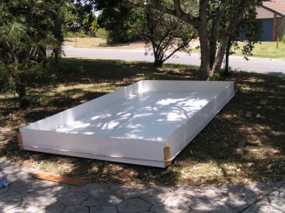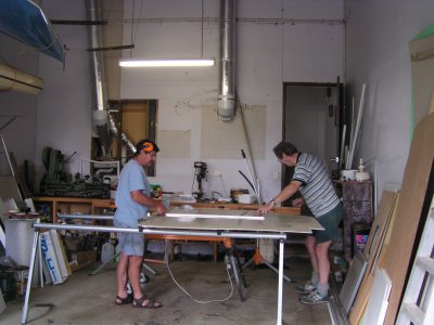 The panels were drawn as 3d components in Sketchup, including drawing the rebated joints. It was simple to copy those components and re-assemble them as a flat sheet from which they could be cut. The panels are manufactured as 11m x 2.5m. Vanglas, the manufacturer, has a very large router. File incompatibilities got in the way but it was relatively simple to redraw for the machine and let it cut the bits. They arrived like some giant Ikea flatpak on the back of a small truck (easier than me collecting them). Here stacked against the garage wall, roughly in the sequence in which they will be assembled. The essence of laminates is that the strength is in the skin, the bit in the middle is just to keep the skins apart. |