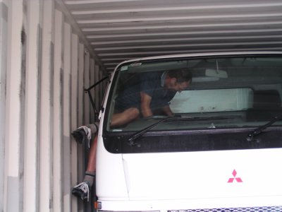 Container ready. It will be shipped to Malaysia. Mirrors, exhaust and air inlet will be removed just before putting it in the container. The doormat goes inside! |
