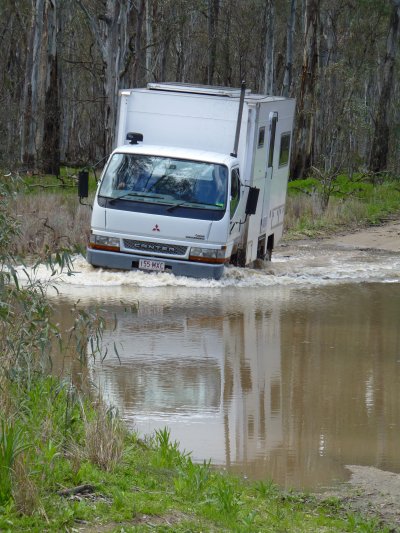 The first track we tried got a bit muddy so we tried another. A ranger coming the other way mentioned there was some water over the track that he'd had a bit of trouble with - but "you'll be ok in that". About 700mm deep where we crossed, a lot deeper to our left. |