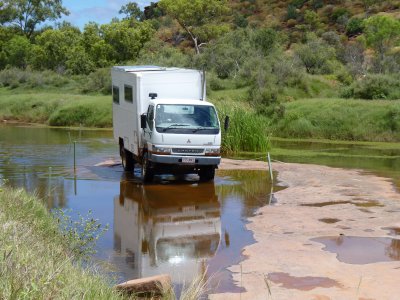 Mostly sandstone underneath, just lots of holes in it and the occasional rock. There's a good view of all the rocks and holes from the cab.. The water was clear with a little flow. The wheels get to be at interesting angles. Its a relatively easy track, well travelled, that just needs a bit of patience. The 4wd tour operators seem to travel a bit faster than us. |
