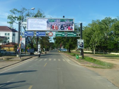 We haven't figured out the difference between green and blue, though we think green is for the bigger places. They bear no relation to lanes. The road to Phnom Penh from Siem Reap involves a right turn, somewhere in the next 500m or so. We think! |