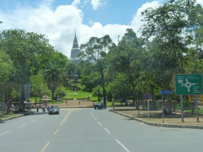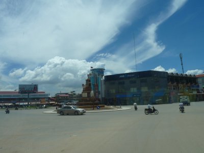 There is really no alternative than to drive through the middle of Phnom Penh. This is the first roundabout encountered when arriving from the South. Not too bad. Its a Sunday. Yes, that's an ANZ Bank in front. |