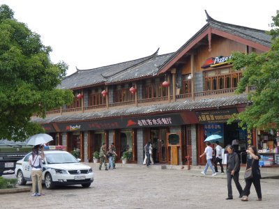 Of course .... we knew that! The center of town. We are mildly bemused by the difference between the focal points of Li Jiang which sells grass for the horses and Shaxi which puts on a show at the theatre. |