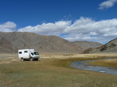 The river flows from a lake next to Tsugaannuur. It finally dawns on us that this time there isn't a "down" in Mongolia to match the "up". We are destined to spend the next few days, before entering Russia, at about 2000 m with temperatures approaching zero centigrade - and below. Hopefully the heater works. |