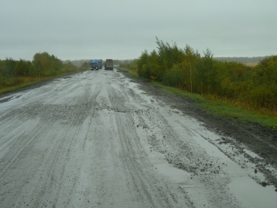 The road had dropped down into the Ishim River valley. The valley was wide like the Ob but the river had much less water. The road across the valley was horrible. Potholed and broken. A long crawl in a long line of trucks. We took a detour through Abatskiy. To the bank. |