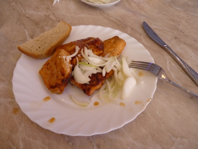 Our lunch consisted of four pieces of very lean pork, some onion, bread, and a nice sauce. | |