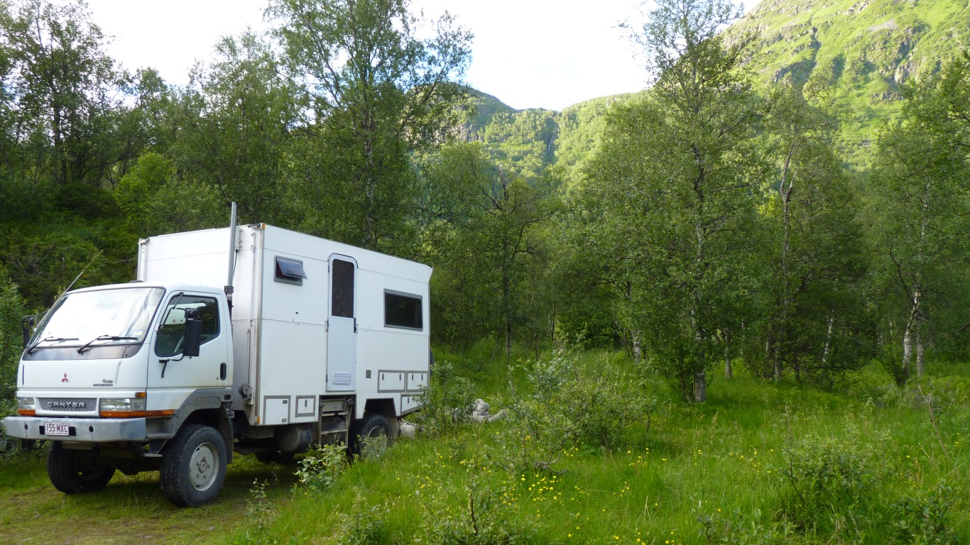 Its as windswept and wet as it looks. We suspect we'll be alone tonight! And we don't expect to be doing any walking tomorrow. We are looking towards Hadselfjorden and the open sea. We expected a large sign and a big car park for Moysalen National Park. This car park has a view. The one for the track into the park is a couple of km east. Its at N 68.4654, E 15.4412 We nearly missed the small sign hidden in the trees after consulting two maps, the gps, and simply working out where the valleys and rivers were. Totally useless statistic .... the angle of the hill on the right is 55 degrees from the horizontal. |
