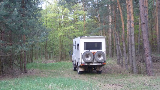 A small sandy track about a km into the woods. Temperatures above 20 degrees again. Inspection suggests the truck, and new shock absorbers, survived the E65 hammering. |