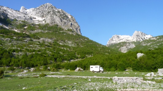 While talking to a German couple on motorcycle, who sadly turned back as the stones were too hard for them, this Albanian gentleman passed carrying a large (about 25kg) sack of potatoes. His wife was driving a pair of donkeys. When we set off we offered to put the spuds in the back. Almost no English - and Albanian is of Illyrian origin, as distinctive as Basque. Near where we offloaded the spuds, to be planted in a small field ploughed by donkey power, he directed us to a field where "many tourists stop". We could see faint tyre marks in the grass and some old campfires. So we stopped. In contrast to Morocco, where there seemed also an expectation of more, there were no strings attached. Simply giving someone with a heavy load help. Just like pulling someone out of a river in Mongolia. On reflection, the Italian aid worker (driving a newish Toyota) who also stopped for a chat with us must have passed the potato carrier. Which left us wondering about the nature of aid and how its delivered. |