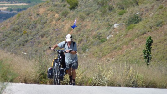 Ian. A lone Kiwi cyclist. Day three of three months cycling in the Peloponese Penninsular. Water and salt provided. |