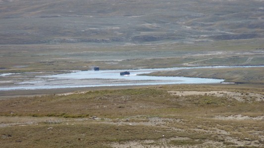 They took the course across the island we thought would be used. Difficult to tell. We probably could have crossed OK. But it looks to be near the deepest we've previously crossed. Probably explains why we haven't seen any cars. Nothing but these two and a horse rider all day. The truck drivers appeared to treat it with a little respect. Only one at a time and first across waited.. |