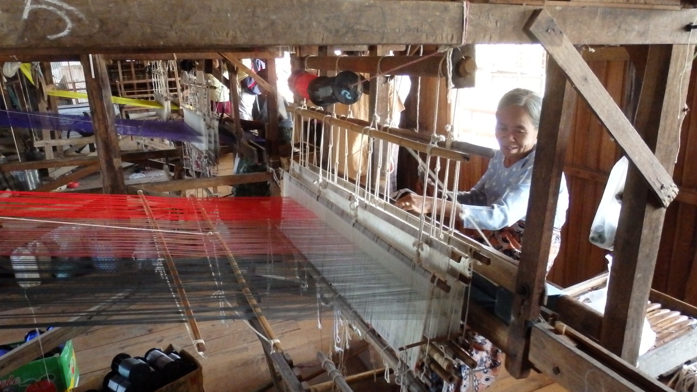 The looms have hand operated flying shuttles. This lady was quite happily operating the 5 combs with her feet and changing the 5 shuttles periodically, while chatting and smiling. About 1m of weave per day. |