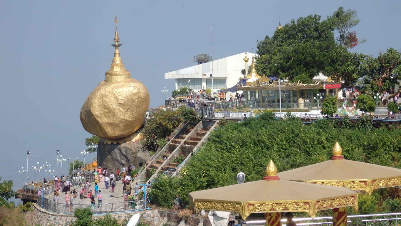 The important bit for the pilgrims is the pagoda. Kyaikhtiyoe Hsantawshin Pagoda. The rock represents an Ascetic's head. Buddha visited and gave his hair to the Ascetic Twira. The hair is enshrined in the pagoda. |