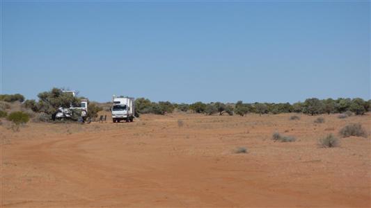 It sort of faded after about 1km. We walked east, across a couple of dunes and swales. Another km east we would have reached a dry lake which appears on our maps. Instead we turned north along the dune top to the road, then back to camp. |