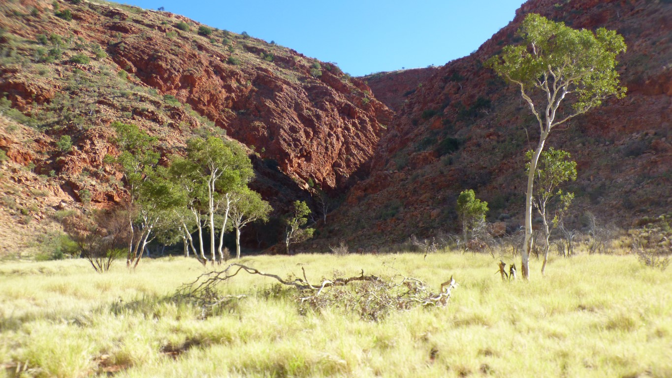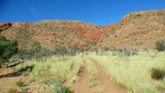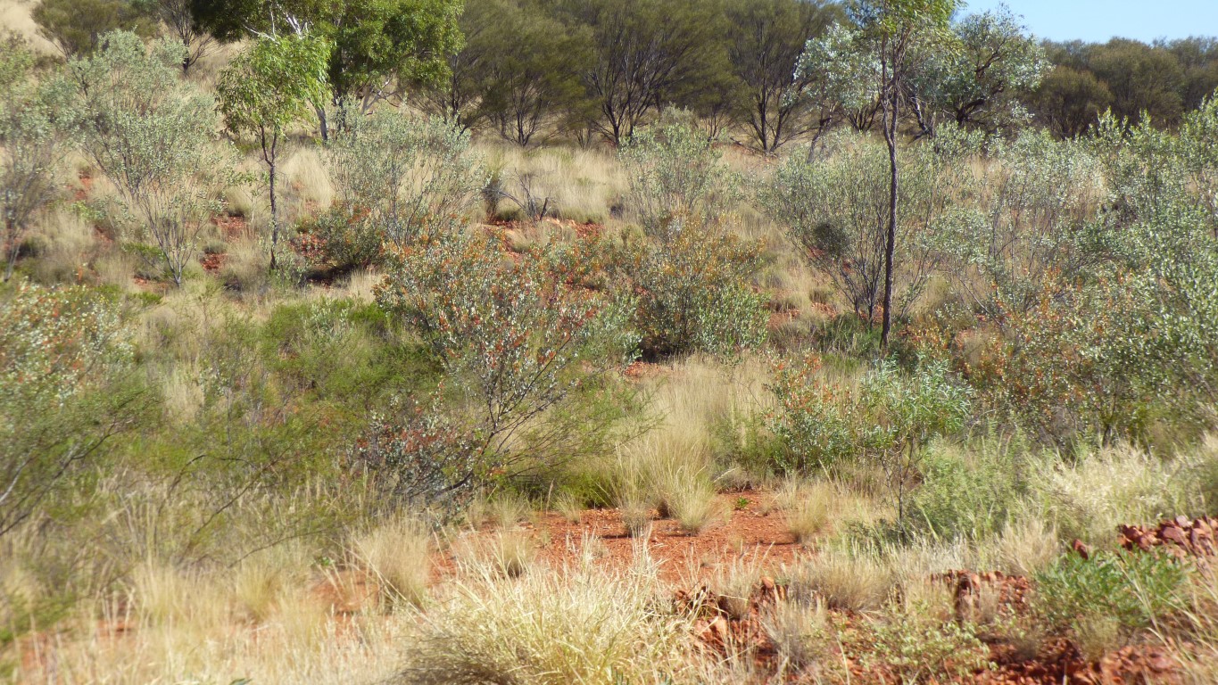 to Finke, but they didn't have a race with us. Finke is in its own biogeographic regionalisation. There are 89 such regions in Australia. The result of "a landscape based approach to classifying the land surface, including attributes of climate, geomorphology, landform, lithology, and characteristic flora and fauna". We are now in the Central Ranges. The Gary Junction Road, which we join about 250 km north so we can head west, runs between the Gibson Desert and the Great Sandy Desert regions. The most obvious changes we notice, they have to be obvious for us to see them, are in the ground cover and trees. We think we are seeing something similar to the cane grass we saw on top of Simpson Desert dunes. We are seeing both spinifex and cane grass. Basically though, all we really know is "its different". |