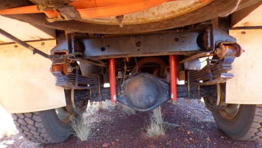 Just checking. The truck is reasonably level. Still supported by springs. The right spring hanger is obviously pushed to its limit. The curve at top of pic is the spare wheel, with a bit of webbing for safety if the wheel winch (chain) gives way. My guess, from the wear on the end of the second leaf, and underside of main leaf, is that it happened somewhere in the last hour or so. On some very heavy corrugations. I remember them well. There was a detour. Just one patch of corrugations and a momentary lapse in concentration. The spring may have been weak from Morocco and Asia! |