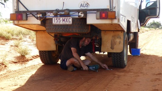 might camp after another about 75 km. Looks like Tuesday before we reach Kintore. Water is salty tasting, just as we read. Unusable for us. Sadly, tonight's inspection revealed a broken rear spring main leaf. Satphone used to provide all details to daughter Jennifer. Today is Sunday. Information Centre at Newman can accept package for us (many thanks). Major couriers all deliver there (its a major mining town on a main road). We'd planned to head there anyway (they have a Woollies supermarket). Communication to spring supplier in Yandina, Queensland, will have to wait until tomorrow morning. I have some clamps, and a bit of steel, and believe I can arrange things so that their is some support from the main leaf and the second leaf can slide. I'll add some grease. We'll let some more air out of the tyres. Travel at 30 km/hr. More than 1,100 km to Newman. That's at least 33 hours driving. 20 km/hr at least 50 hours. Will replacement part get to Newman before us? My guess is at least a week. Not including the day to prepare and ship. Really it means a couple more hours driving each day, lots of care, and stopping about as often as we were going to anyway. Though we may look closely at the map and miss Karlamilyi National Park. Let's take one day at a time and see what happens. |