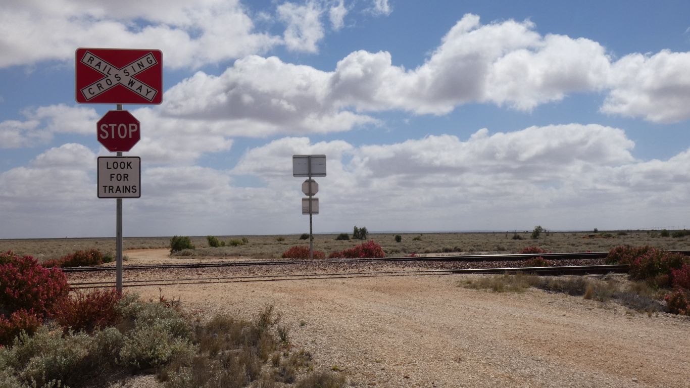 to be at Watson. A passing point on the otherwise single line railway. Having crossed the line we look north. The Ooldea Ranges are visible on the horizon, to the right of the far crossing sign. They are not particularly high, but stand out on an otherwise seemingly featureless landscape. |