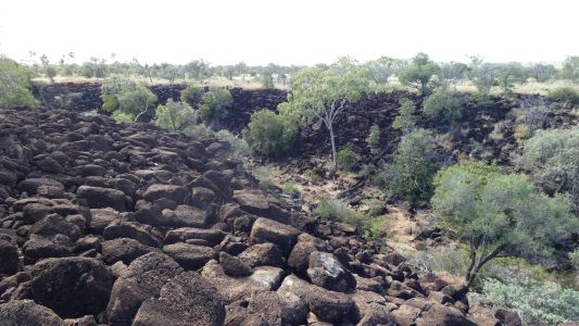 First stop Eaglehawk Gorge on Porcupine Creek. Very much volcanic looking. Basalt. From Mt Desolation, and after much searching our maps we discover it, 24km almost due west from the lookout. -20.4670,144.1993 There are black basalt soils and red in the area. |