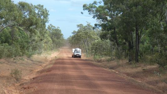 The gravel road is good. A couple of road trains each day. 4wd tourists headed our way in a variety of vehicles, with camper trailers, pop-tops, boats, off-road caravans. Even a few coming south. | |