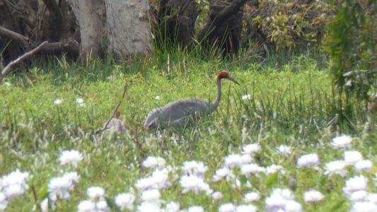 Cranes. Like Brolgas, but they arrived in Australia around 1966 and very much less common than Brolgas. The red stretching down their necks is the only real clue. |