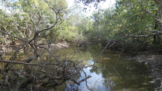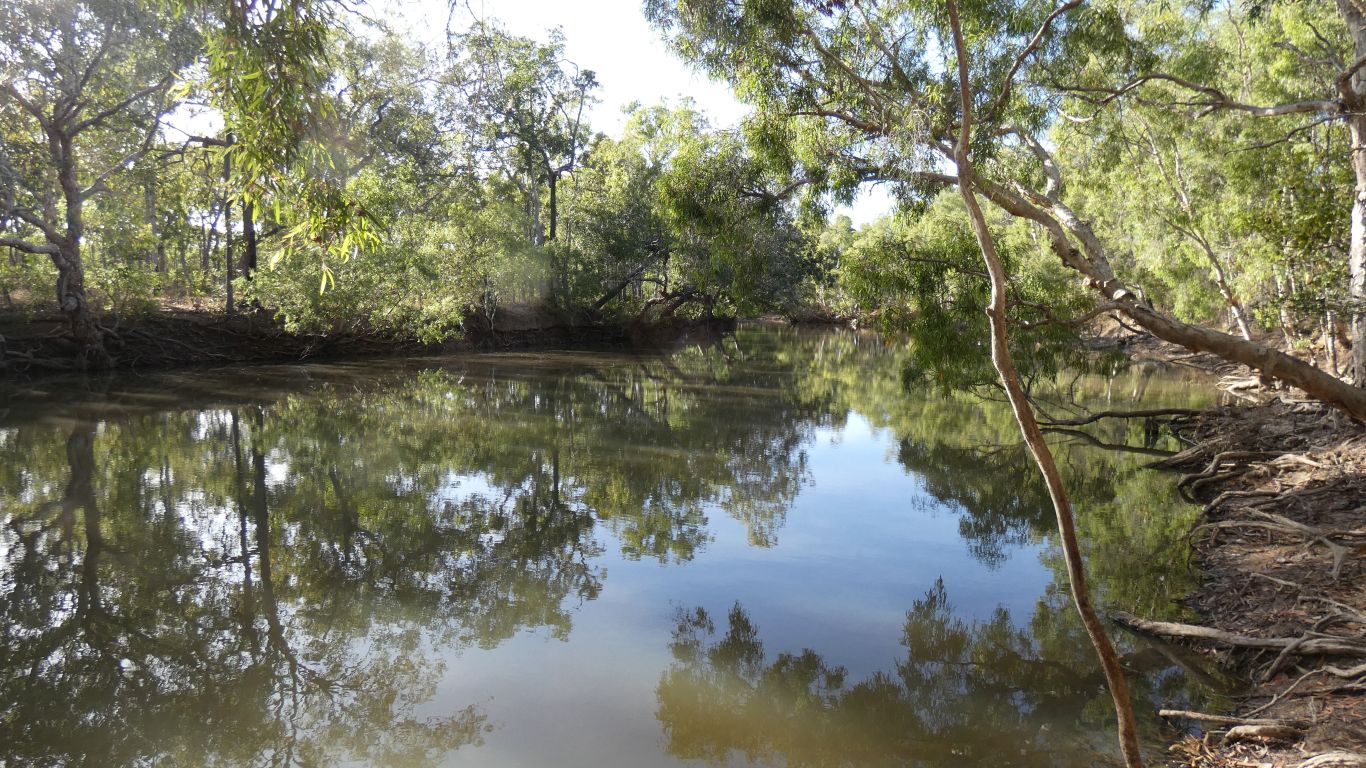 short creek, flowing fast enough to carry sand. Dry at this time of year. The only evidence we find, the swamp must be predominantly rain filled. We suspect in the wet season it may overflow to the north through a wide shallow path. It doesn't seem to be part of the river system though presumably if the river rises faster than the swamp there's a flow into the swamp. We can see the edges have dried as the water level has fallen in the swamp. We suspect the water lilies may limit evaporation so the swamp may be shallow but stays wet throughout the year. |