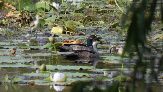 the lilies. Today, on a short stroll along the edge of the swamp four flew in to join the Lotusbirds. A bit bigger, different wing beats, different landing ..... and they float. There were two pairs of Green Pygmy Geese. The Lotusbirds don't seem to mind other birds near. They also weren't disturbed when a darter surfaced among them. Its just us they are all cautious of. |