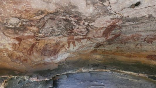 Which my failing memory fails to retain for very long. The site has four galleries, associated with initiation of boys into men. We see it a bit backwards. The initiants crawl through a small passage from where initiation rites are conducted to this "room" then move to "recovery". There are several layers of painting, the site was possibly active until the 1950's. We can count four pages, each less distinct, though there are probably more. The six fingers of the male with headdress suggests a person of some importance.