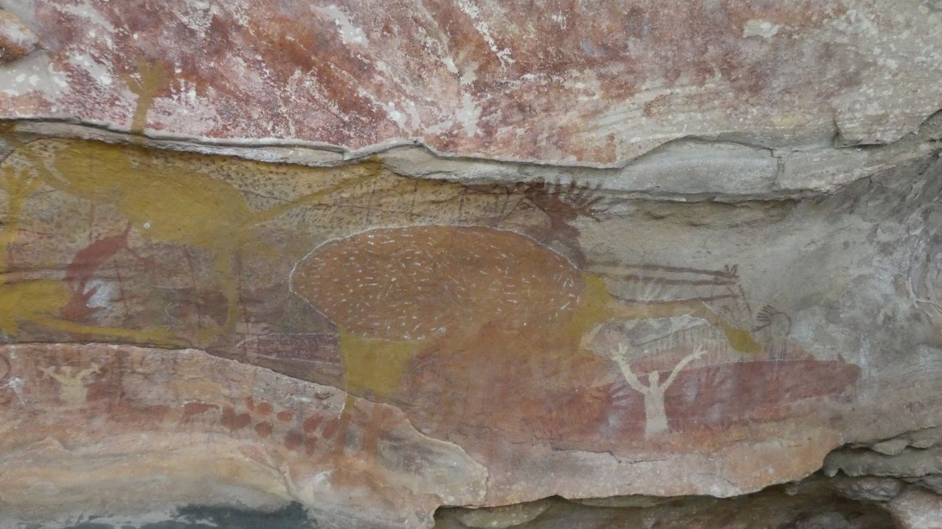 of our first site. More of a meeting place. It is near where the Laura Dance Festival is now held. - every two years, but sadly this year has been delayed until next year. Towards the left is perhaps a kangaroo hunt, a kangaroo track and a human footprint. Either side are garfish. These pics are a bit faded, there's not yellow or white ochre. I always assumed just ochre and water to make paint. More complicated, it seems there's a recipe involving animal fats. A recipe which seems to have been lost. |