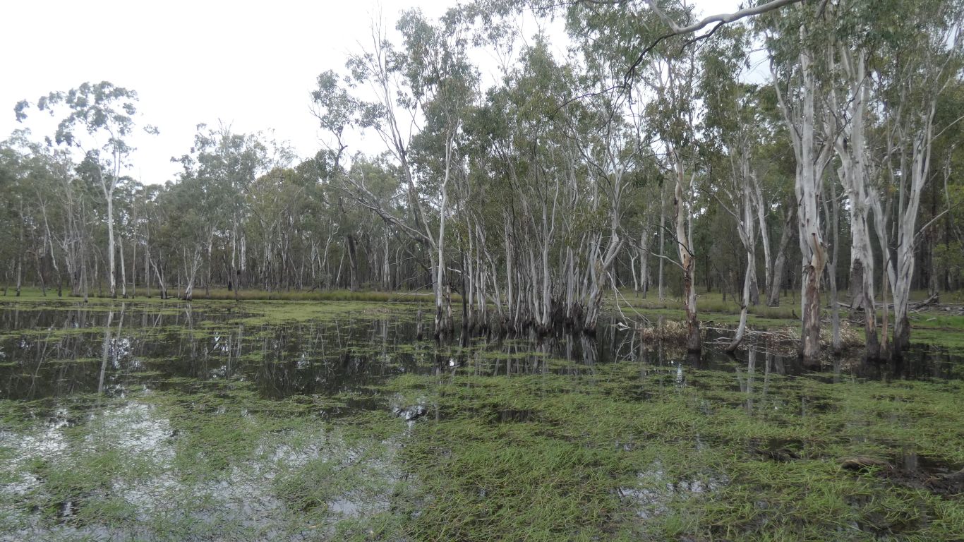The creek a muddy brown billabong with no water flow. Apparently fish in the creeks. |