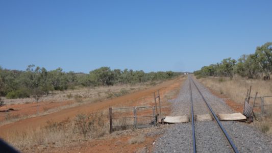 the main line between Mt Isa and the coast. It takes a long loop south, via Duchess, to Cloncurry, which is almost due east. The terrain is almost flat. Unlike the road we took yesterday, due east of Mt Isa towards Cloncurry. East of Cloncurry is also almost flat, with long straight stretches of road and rail. |