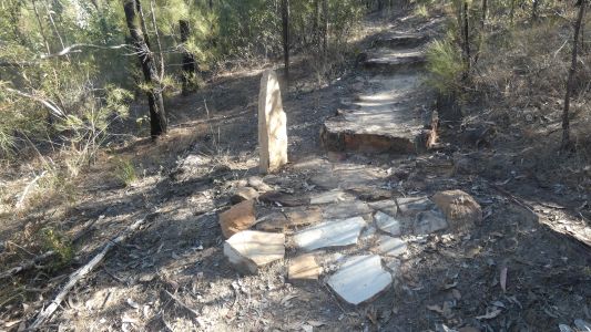 immediately below us. Its possible to walk through the gorge from yesterday's track. About 4-5km in the gorge. From this lookout I followed a track east, along the side of a steep gully until I could cross it. An old blue arrow on a rock to mark the indistinct track. I followed the track a bit south, parallel to the gorge. From the lookout it looks like there is steep access to the gorge if I had followed it far enough. |