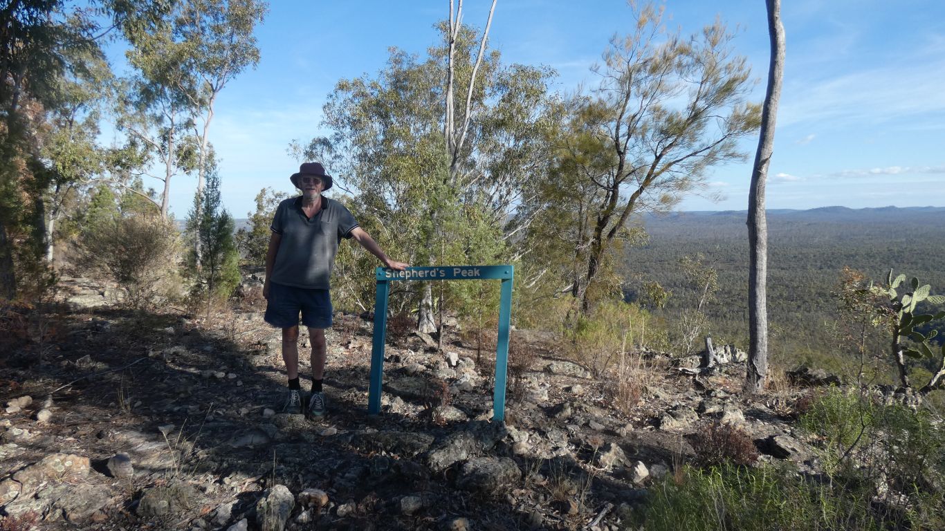 Every so often we feel the urge for a "we wuz here" pic. The sign helps with the "here". It goes with the feeling of awe. Which we are told is good for us. Mobile phone at the top, a couple of pics to daughters. The peak is a long (at least a km from the satellite view) ridge. Narrow. As far as we can tell it doesn't seem to join any of the surrounding hills. Lots of evidence of fires. Some very recent burnings, the park was closed a couple of weeks ago. And some high temperature, destructive, unplanned, fires. We can see large patches of dead trees in the distance. |