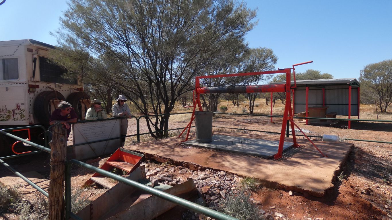 it submerged to contain 50 litres. Sometimes we were impatient and only retrieved 30 litres. With about 150 litres each that's a lot of winching. So we all needed a rest, to contemplate what must have been required to extract 60,000 gallons / hour, the quoted capacity of the well. And wonder if the cattle could drink that fast. ..... we think the tank is a modern addition, now disused. |