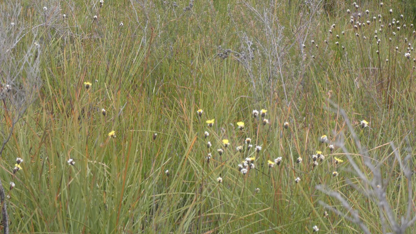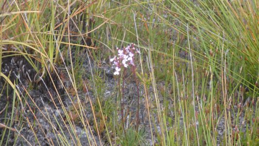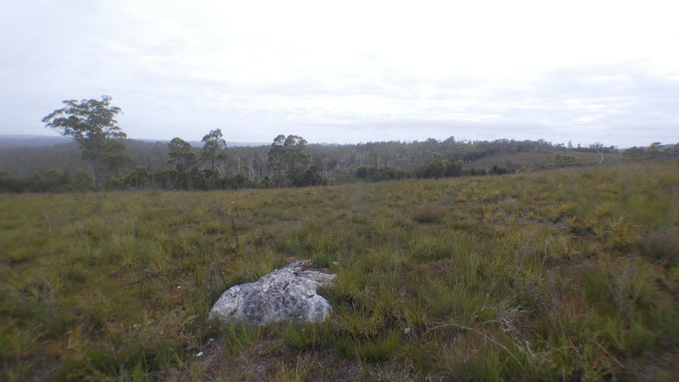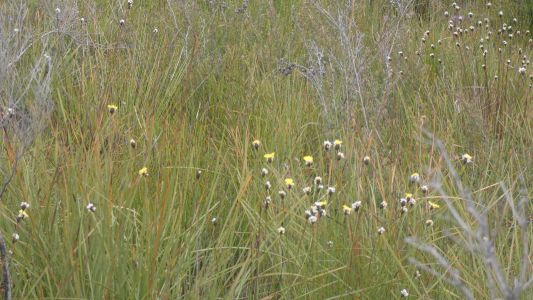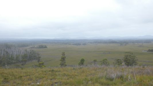 Not all button grass plains are born equal. Whatever the cause, perhaps the underlying siltstones and peat, there seems to be more variety in the vegetation. The satellite image shows this area as red rather than the colour of all the other button grass plains. Looks like its been burned in the last year or two and is recovering. Its not as dense as Milkshake Hills, I can walk through it easily. Every mention of "button grass plain" is at pains to say that button grass is really a sedge. Grasses, of which there are more than I've had hot dinners, have hollow stems with nodes/joints, while sedges have solid triangular stems with no nodes. Sedges prefer more moist conditions than grasses. We can't help noticing that all the tracks we have walked have been dry, despite being in rain forest. The track we are walking on has gravel laid. We suspect it becomes a peat bog fairly quickly with a little rain. |
