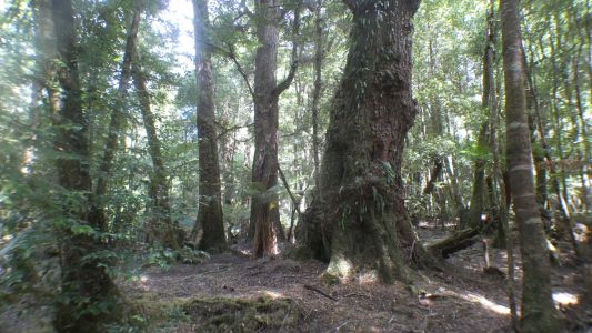 The forest is dry, but its obviously rain forest. Trunks of trees and tree ferns festooned with moss, lichens, and epithytes. |