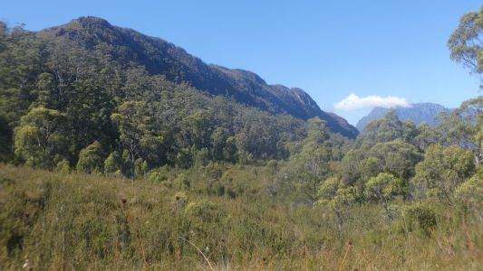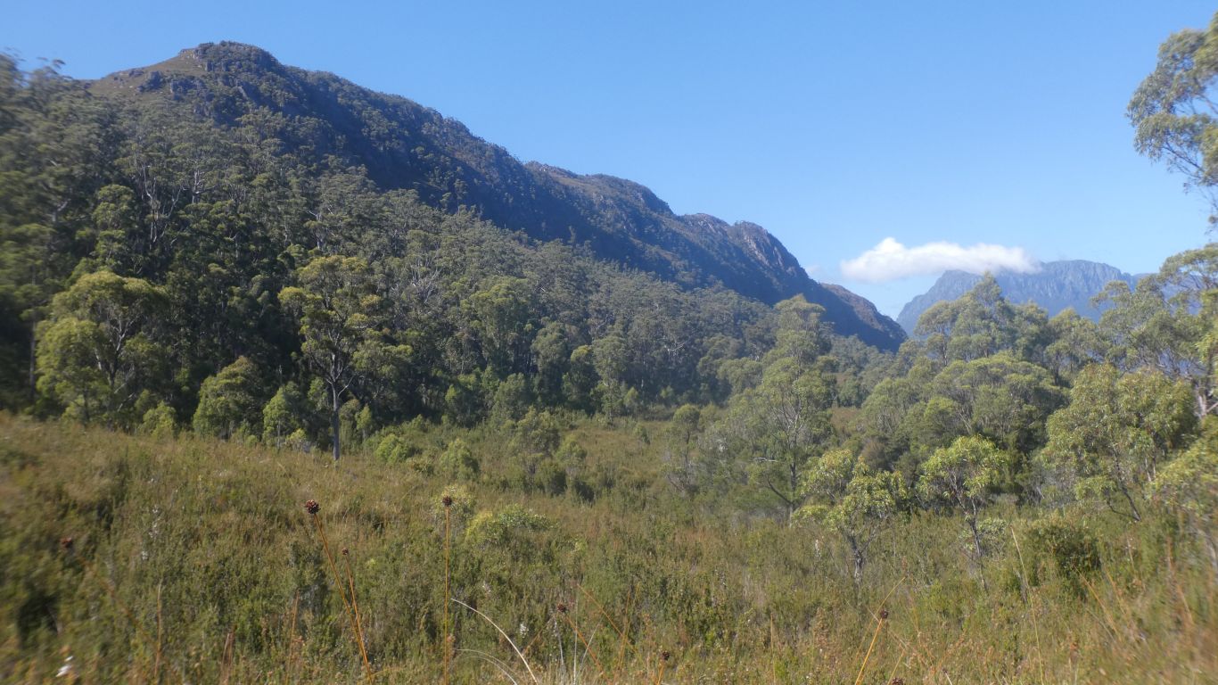 We emerge from the tree line. The ridge of Mt Farrell in